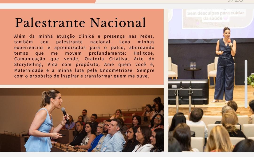 Temas: Halitose, Comunicação que vende, Oratória Criativa, Arte do Stortelling, Vida de propósitos, Ame quem você é, Maternidade, Luta pela endometriose.